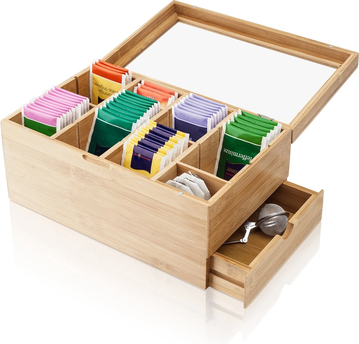 De Amazy opbergdoos voor thee is het perfecte cadeau voor alle theeliefhebbers en biedt voldoende ruimte voor theezakjes, kandiesuiker, lepel enz. Hij is gemaakt van hoogwaardig bamboe hout en voorzien van een transparant deksel.