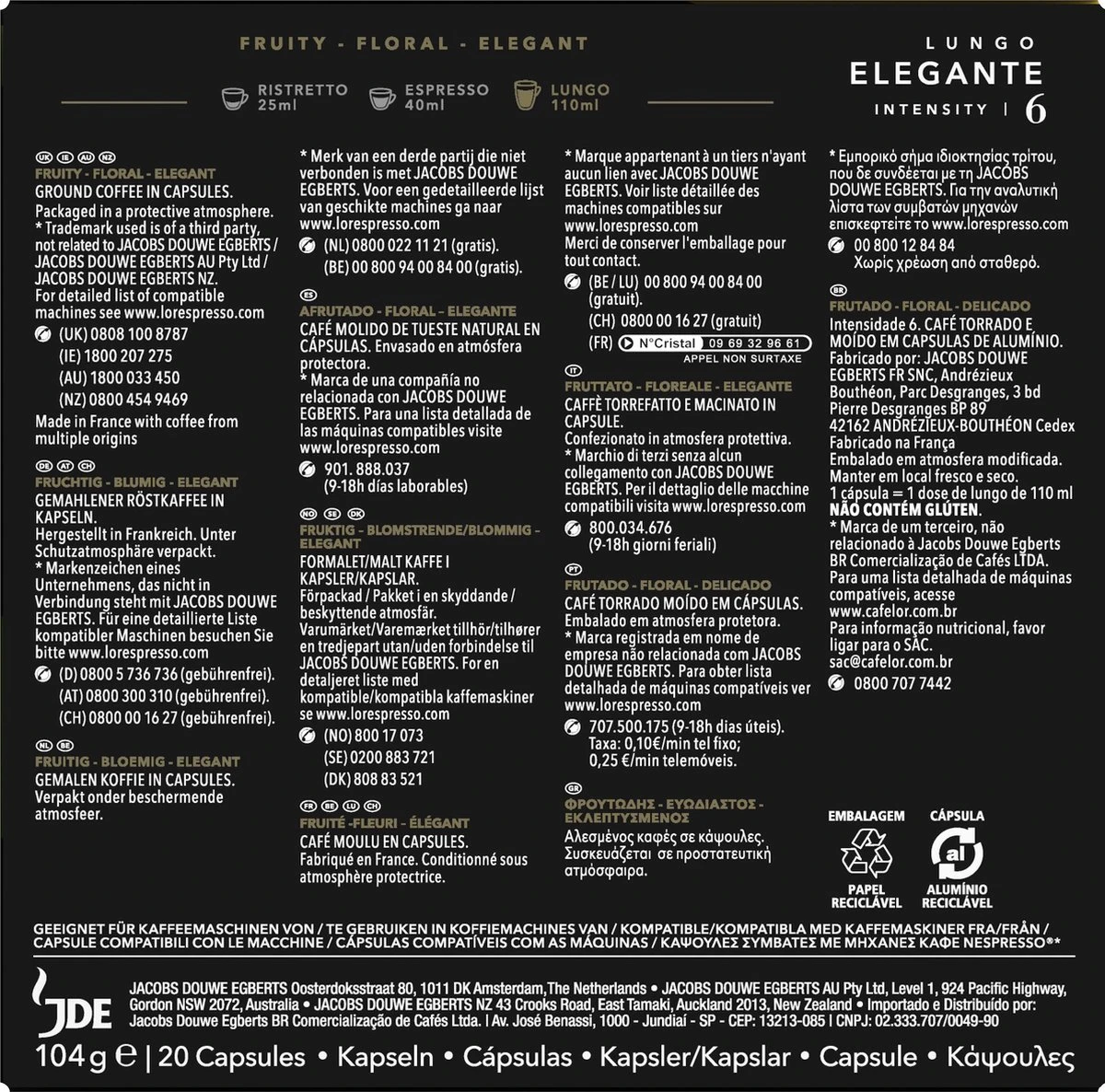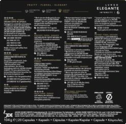 Ontdek het delicate karakter van Lungo Elegante. Een fruitige, bloemige koffiemelange waarin noten van citrusvrucht en zwarte bes het middelpunt vormen en voor een licht gouden crèmelaag zorgt.