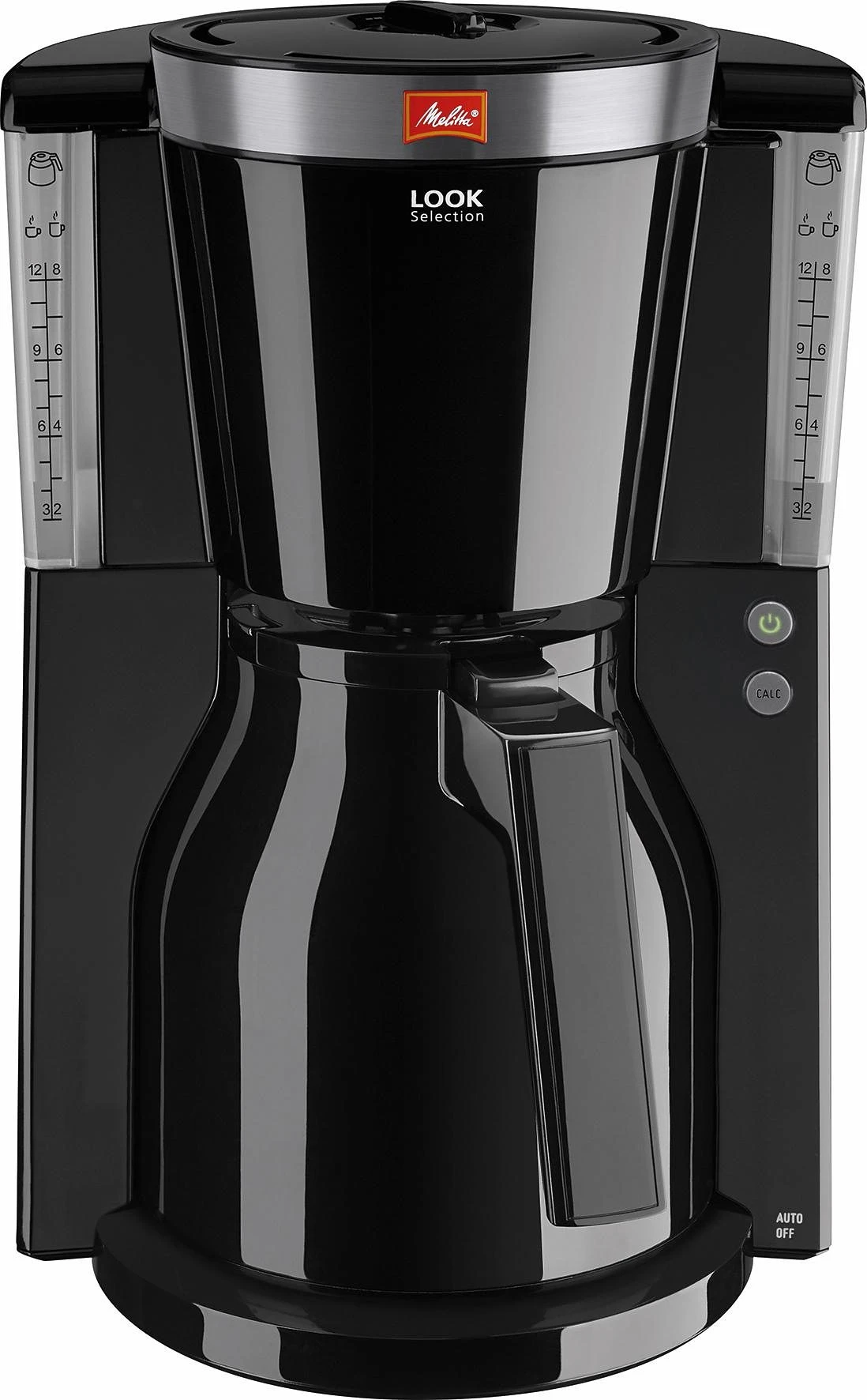 Ben je op zoek naar langdurig koffiegenot? Dan is de Melitta® Look® Therm Selection de juiste keuze! Dankzij de AromaSelector® kan de sterkte van de koffie apart ingesteld worden. De thermoskan beschikt over een eenhandsbediening en een goede warmhoudfunctie. <br><b>Speciale eigenschappen: </b><br><ul> <li>De gepatenteerde AromaSelector® zorgt voor een optimale smaakbelevenis. Met slechts één druk op de knop kan dankzij de AromaSelector® de smaak van de koffie van mild tot krachtig ingesteld worden. De water- of koffiehoeveelheid hoeft hiertoe niet veranderd te worden.</li></ul><b>Overige specificaties: </b><br><ul> <li>Het koffiezetapparaat biedt een 3-in-1-antikalk-bescherming. De waterhardheid kan geprogrammeerd worden, de mate van verkalking wordt getoond en een automatisch ontkalkingsprogramma is ook aanwezig.</li><li>De thermoskan is bijzonder gemakkelijk te hanteren door de comfortabele eenhandsbediening. De vers gezette koffie kan door de slim uitgevoerde handgreep van de kan gewoon uitgeschonken worden.</li><li>Thermoskan met goede warmhoudfunctie, geïntegreerd snoervak, breukbestendige filter, veiligheidscertificeringen (VDE-GS)</li></ul><b>Kenmerken & functies: </b><br><ul> <li>Filtermaat: 1×4®</li><li>Soort kan: thermoskan met eenhandsbediening en doorloopdeksel</li><li>Inhoud (liter): inhoud waterreservoir: 1,1 liter</li><li>Aantal kopjes: 8 kopjes</li><li>Druppelstop: ja</li><li>Uitneembare filterhouder: uitneembare zwenkfilter met uitneembare filterinzet</li><li>Automatische uitschakeling: automatische uitschakeling na 15 minuten</li><li>Afneembaar waterreservoir: nee</li><li>Waterniveau-aanduiding: transparant waterreservoir met aan beide kanten aanduiding aantal kopjes</li><li>Afneembare delen geschikt voor de vaatwasser: zwenkfilter en filterinzet zijn geschikt voor de vaatwasser</li><li>Aan-uitschakelaar met controlelampje: verlichte aan-uitschakelaar</li><li>Warmhoudfunctie: ja</li></ul><b>Extra functies: </b><br><ul> <li>Uitgang van het netsnoer op de linker en rechterkant</li></ul><b>Technische gegevens: </b><br><ul> <li>Vermogen (W): 1000 W</li><li>Aansluiting (W/V/frequentie): 920-1080 W, 220-240 V, 50/60 Hz</li><li>Afm. apparaat hxbxd (cm): 35,7 cm x 23,0 cm x 22,0 cm</li><li>Gewicht (kg): 2,28</li><li>Kleur: zwart, elegante edelstalen strook langs de filterdeksel</li></ul>