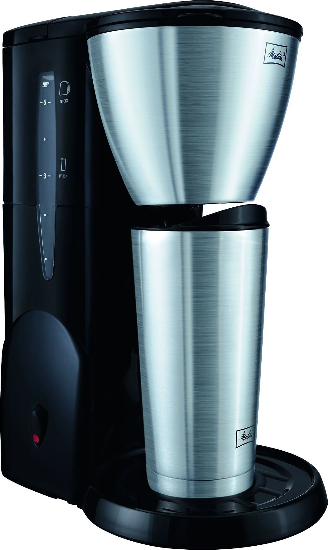 Koffiezetapparaat Single5® M728, thermoskan en beker, van MELITTA. <br><br>Wil je groots genieten van een kleinere hoeveelheid koffie? Wil je je koffie onderweg meenemen? Moet je nieuwe koffiezetapparaat snel en gemakkelijk je koffie bereiden en warm houden? Moet je nieuwe koffiezetapparaat ook ruimtebesparend zijn? Dan is dit model Single5 Therm van Melitta precies wat je zoekt <br><br><b>Speciale eigenschappen: </b><br><br><b>Overige specificaties: </b><br><ul> <li>Verlichte aan-uitschakelaar, waterniveau-aanduiding aan de buitenkant, speciaal ventiel voor optimale koffietemperatuur, uitneembare filterinzet afm. 1×2, 600 W</li></ul><b>Kenmerken & functies: </b><br><ul> <li>Filtermaat: 1×2</li><li>Soort kan: thermoskan</li><li>Inhoud (liter): 625 ml</li><li>Aantal kopjes: 5</li><li>Druppelstop: ja</li><li>Uitneembare filterhouder: ja</li><li>Automatische uitschakeling: ja</li><li>Afneembaar waterreservoir: nee</li><li>Waterniveau-aanduiding: ja</li><li>Afneembare delen geschikt voor de vaatwasser: ja</li><li>Aan-uitschakelaar met controlelampje: ja</li><li>Warmhoudfunctie: ja</li></ul><b>Extra functies: </b><br><ul> <li>-</li></ul><b>Technische gegevens: </b><br><ul> <li>Vermogen (W): 600</li><li>Aansluiting (W/V/frequentie): 600 – 700, W 220-240 V, 50 / 60 Hz</li><li>Afm. apparaat hxbxd (cm): 31×15,3×27</li><li>Gewicht (kg): 1,7</li><li>Kleur: zwart / edelstaal</li></ul>