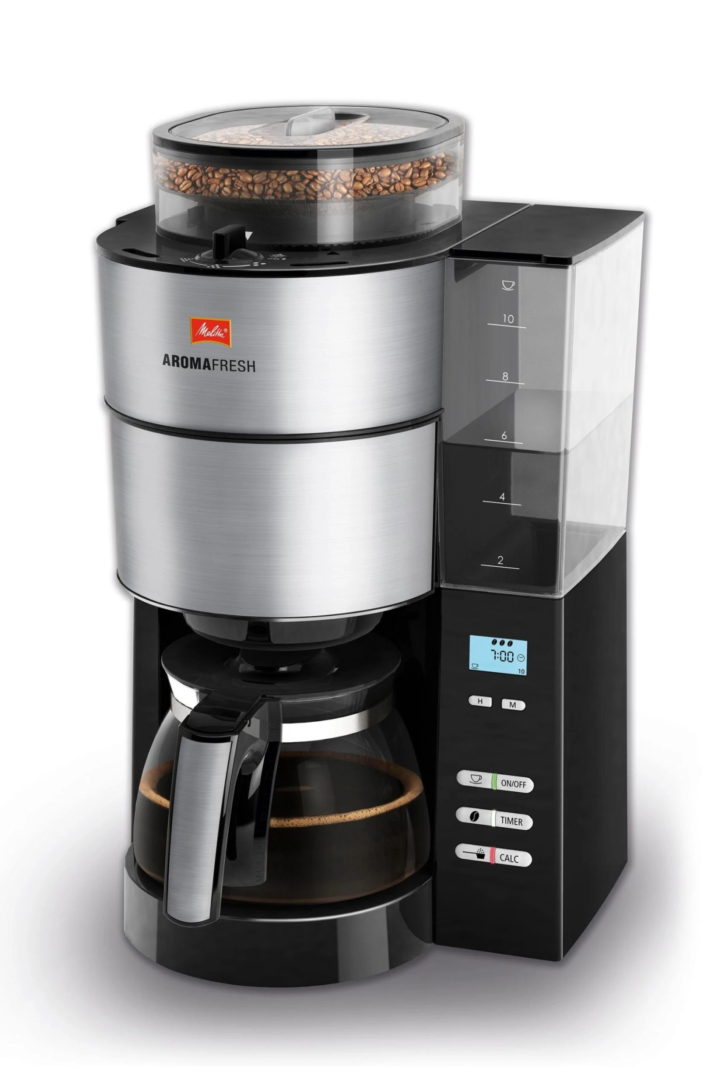 | Overige voordelen | Voor een grondige reiniging kunnen het bonenreservoir en de maalring worden verwijderd. Het meegeleverde schoonmaakkwastje bevrijdt de maalring veilig van restjes koffiebonen. De 3-in-1 Calc Protection functie geeft een noodzakelijke ontkalking aan en ontkalkt het apparaat betrouwbaar., De zwenkfilter van het apparaat is voor eenvoudige reiniging geschikt voor de vaatwasser. De geïntegreerde druppelstop van de draaifilter behoedt de keuken bij de wisseling van de koffiefilters voor vuil., De geïntegreerde warmhoudfunctie zorgt voor een verlengde tijdperiode, waarin de versgezette filterkoffie heet gedronken kan worden. Er kan tussen 20, 40 of 60 minuten warmhoudtijd gekozen worden., Waarom niet met de geur versgezette koffiesoorten gewekt worden? De timerfunctie van de Aromafresh kan op de minuut nauwkeurig ingesteld en via het lcd-display gemakkelijk afgelezen worden., Het hoogwaardige en duurzame stalen kegelmaalwerk kan naar wens bepaald worden. De maalgrofheid is in drie stappen te reguleren. Geheel naar eigen wens kan met de "Grind-off"-functie echter ook al gemalen koffie voor het opgieten van de filterkoffie gebruikt worden. Hierbij wordt het maalwerk gewoon uitgeschakeld. Voor een individuele smaak kan ook bij de sterkte van de koffie tussen drie standen gekozen worden. |