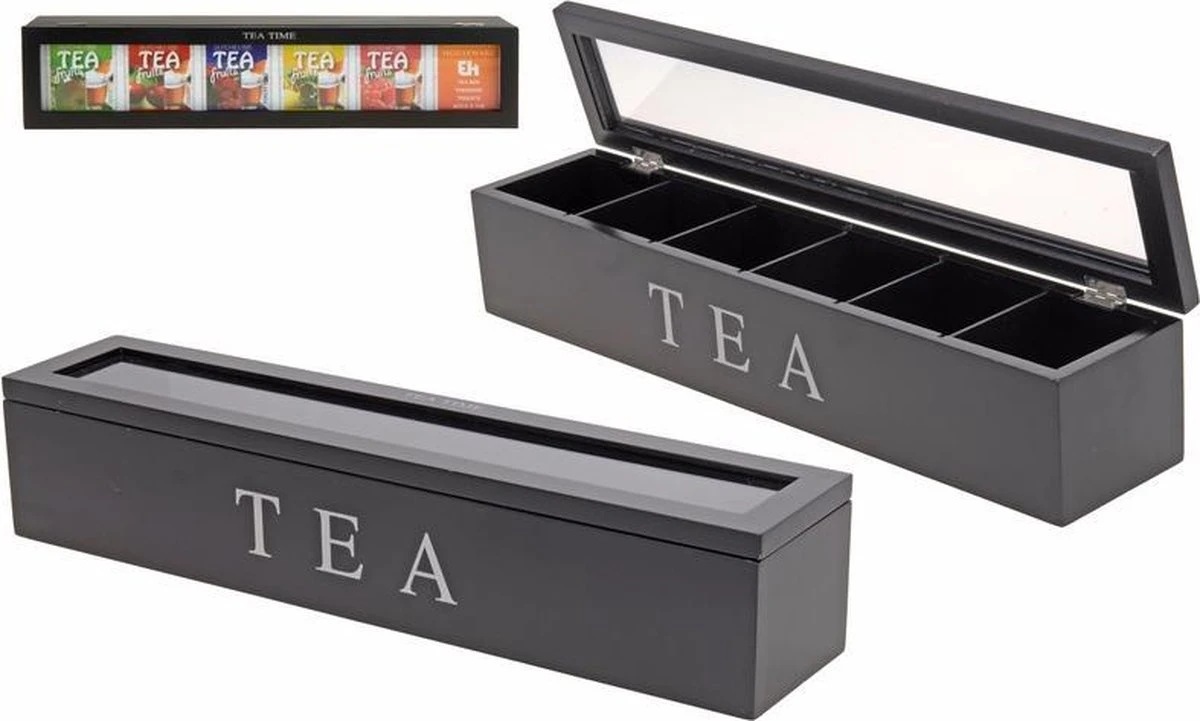 Grote zwarte 6-vaks theedoos 43 cm. Houten theekist met transparante glazen deksel en zilver opschrift: Tea. Deze theedoos heeft 6 vakken voor theezakjes of specerijen enz. Formaat: ongeveer L43 x 8,6 x 9 cm. Formaat per vakje: ongeveer 7 x 6,5 x 5,5 cm. De theedoos is geschikt om theezakjes van 6,5 cm rechtop neer te zetten.