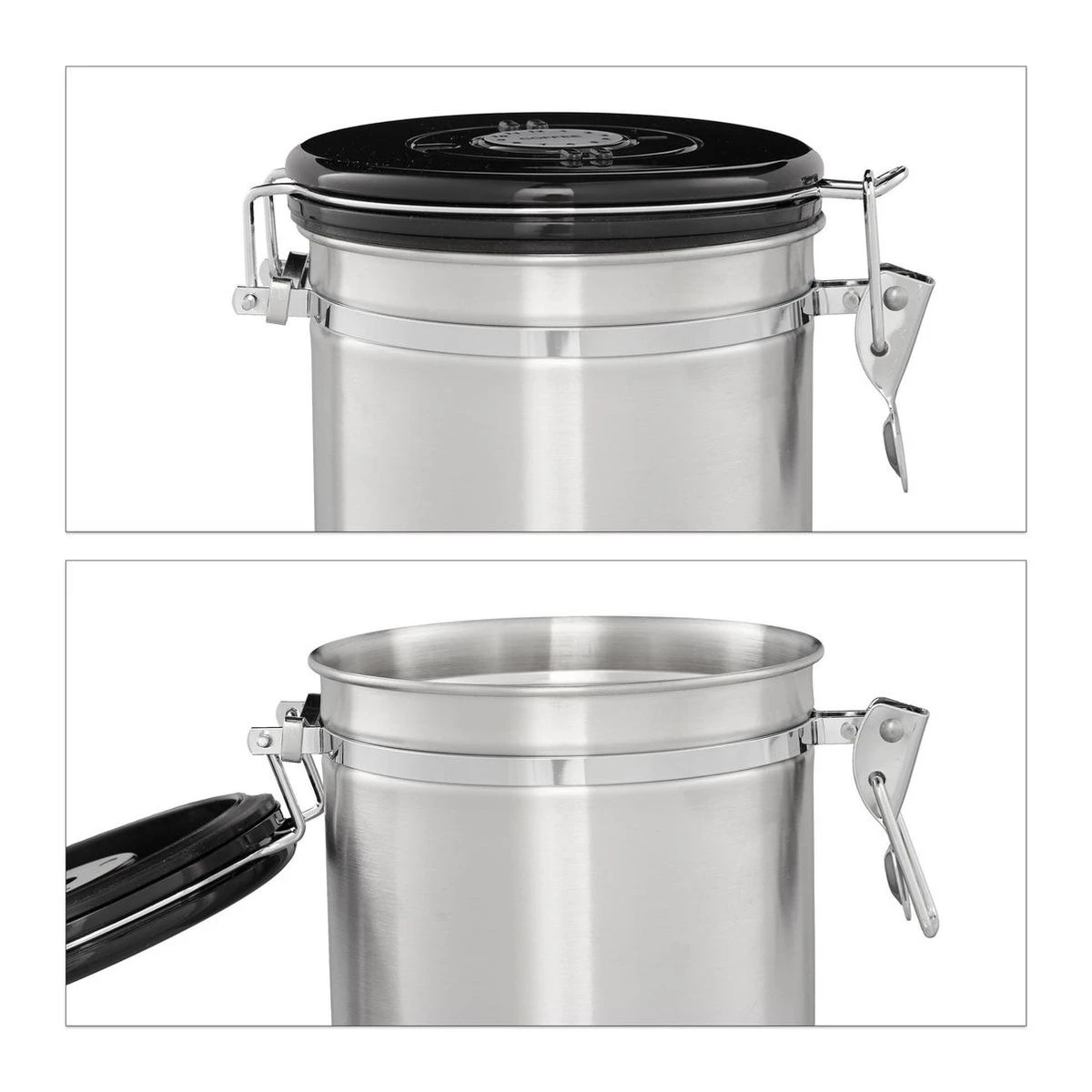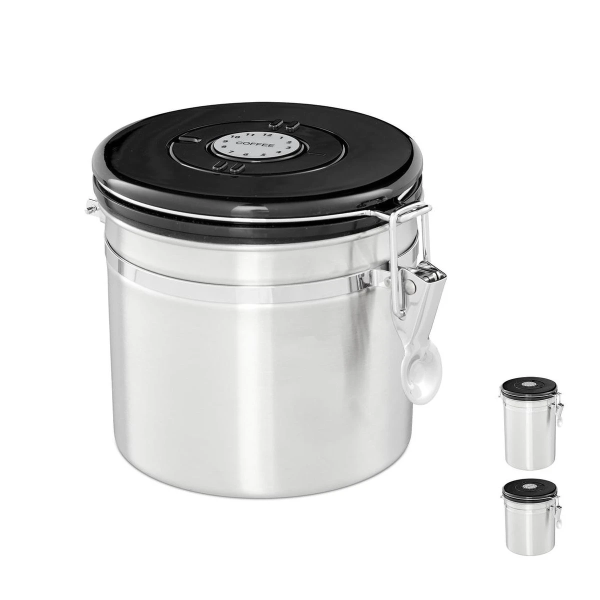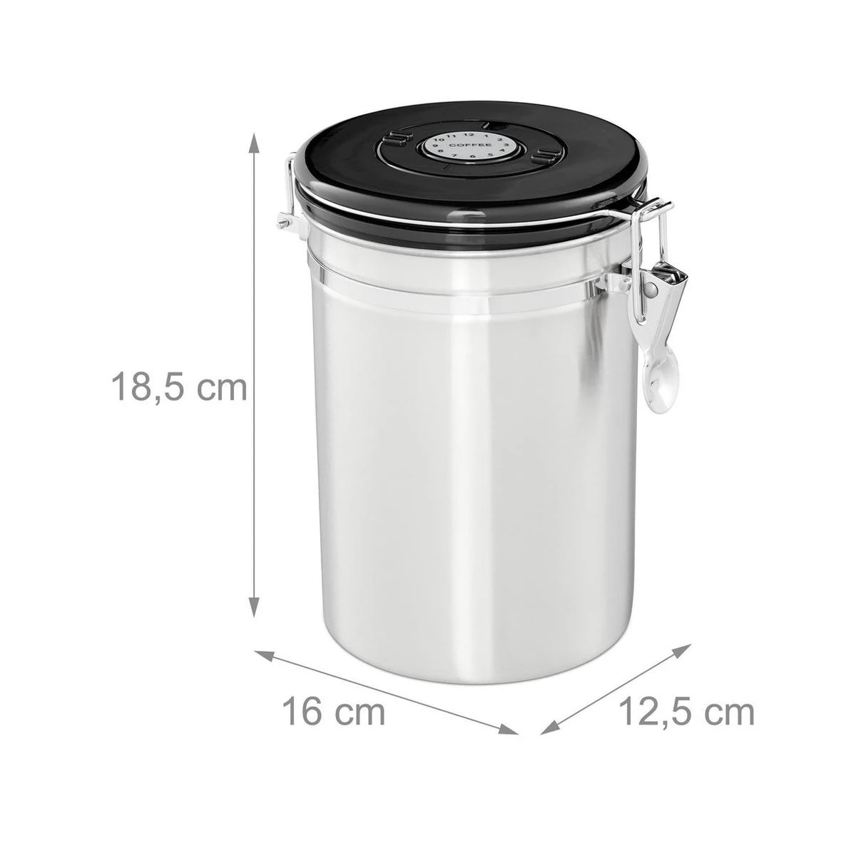 Koffieliefhebbers weten hoe belangrijk het is om koffiebonen of gemalen koffie luchtdicht te bewaren zodat de smaak niet meteen verloren gaat. De deksel van dit koffieblik sluit heel precies en luchtdicht. Hierdoor kun je iedere dag van je warme lievelingsdrank genieten alsof de koffiebonen vers gemalen zijn. Het bijzondere aspect van het stijlvolle koffieblik van rvs is dat je met het tandwiel de dag en de maand van de houdbaarheidsdatum op de deksel in kunt stellen. Koffiebus in detail – Keuze uit verschillende groottes – Materiaal: Rvs, kunststof – Kleur: Zilver, zwart Kleine voorraadbus – Afmeting H x B x D: ca. 12,5 x 12,5 x 16 cm – Volume: ca. 900 ml – Gewicht: ca. 370 g Middelgrote voorraadbus – Afmeting H x B x D: ca. 15,5 x 12,5 x 16 cm – Volume ca. 1300 ml – Gewicht: ca. 410 g Grote voorraadbus – Afmeting H x B x D: ca. 18,5 x 12,5 x 16 cm – Volume ca. 1910 ml – Gewicht: ca. 460 g Luchtdicht blik voor koffie etc. – Koffie, meel, koekjes of thee vers houden in bewaarblik – Simpele en handige beugelsluiting – Aroma behouden door deksel – Houdbaarheidsdatum instellen – Tijdloos en stijlvol design van mat rvs – Snel met de hand schoon te maken Leveromvang – 1x Koffieblik in grootte naar keuze – Decoratie is niet bij de levering inbegrepen