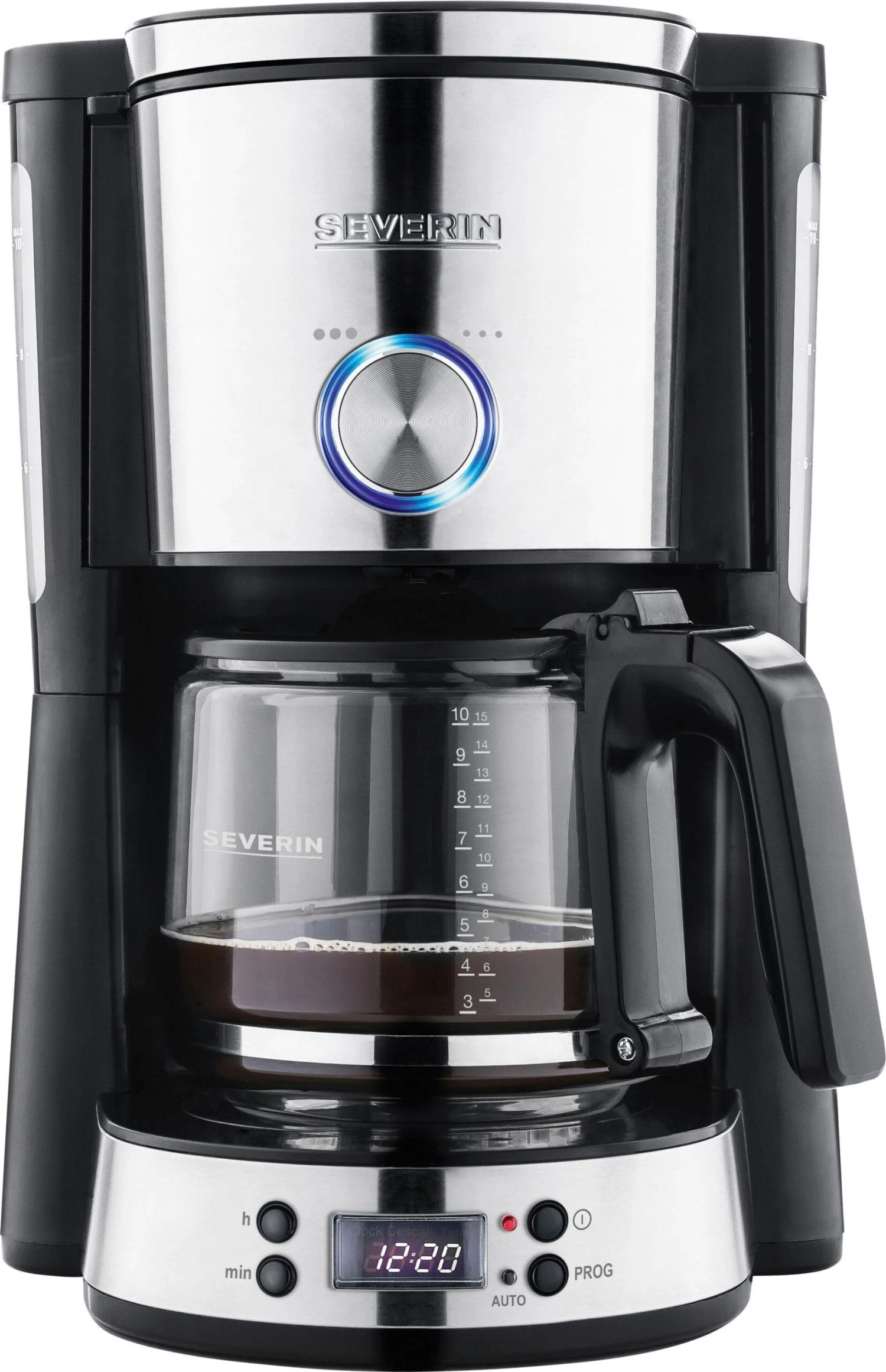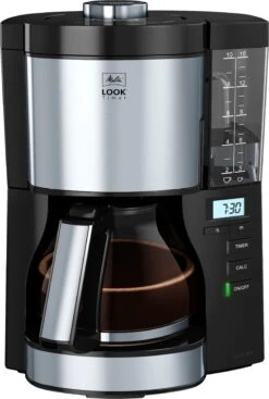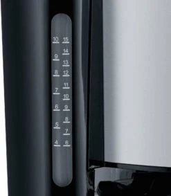 | Overige voordelen | Zwenkfilter met uitneembare filterinzet 1x 4, druppelstop voor het veilig verwijderen van de kan, ook tijdens het zetproces, waterniveauaanduiding, aan beide kanten en goed zichtbaar, automatische uitschakeling, AromaSwitch om uit te kiezen tussen de prima opvrolijker in de ochtend en de zachte koffie voor in de middag, digitale klok met timerfunctie tot activering van het koffiezetproces, ontkalkingsfunctie, design van hoog niveau met edelstalen applicaties, glazen kan met schaal voor vers water en ergonomische handgreep |
